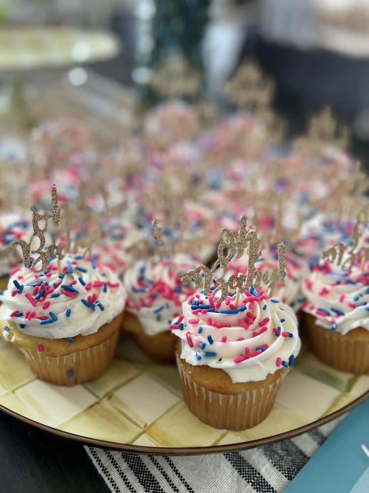 A moist vanilla cupcake with a silky champagne buttercream and garnished with pink sugar and edible silver dragees.