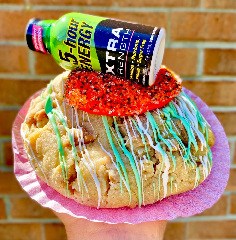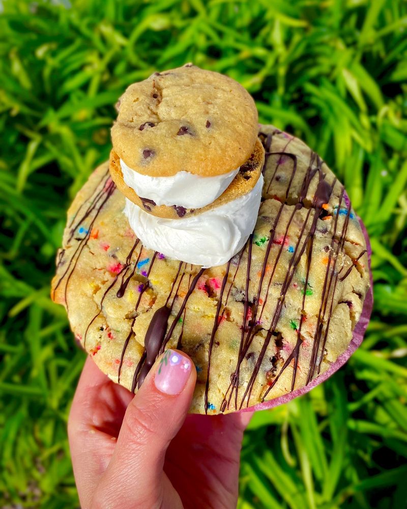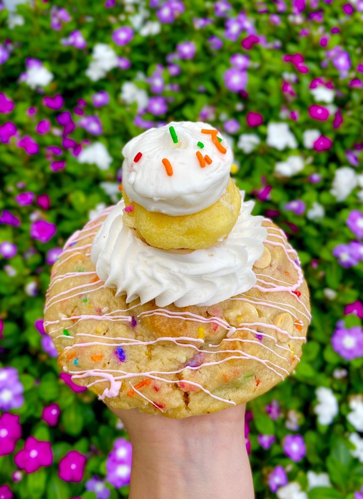 Pack of 2. Our yellow cake with chocolate chips baked in, filled with real cookie dough, dipped in chocolate ganache, and topped with more cookie dough and a chocolate chip cookie.