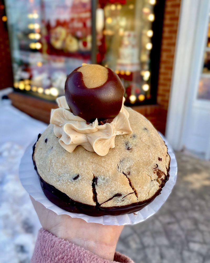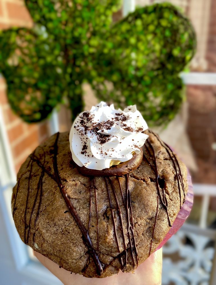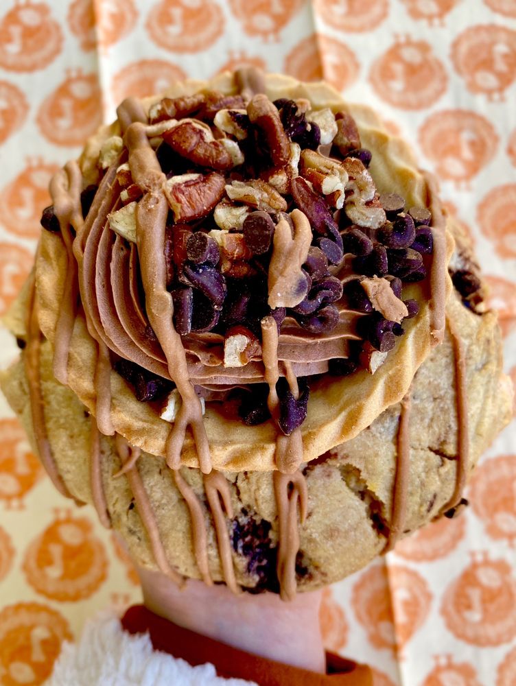 Two of our chocolate chip cupcakes, topped with a swirl of nutella buttercream, rolled in cookie crumbs, & then topped with a dollops of cookie dough & a drizzle of chocolate.