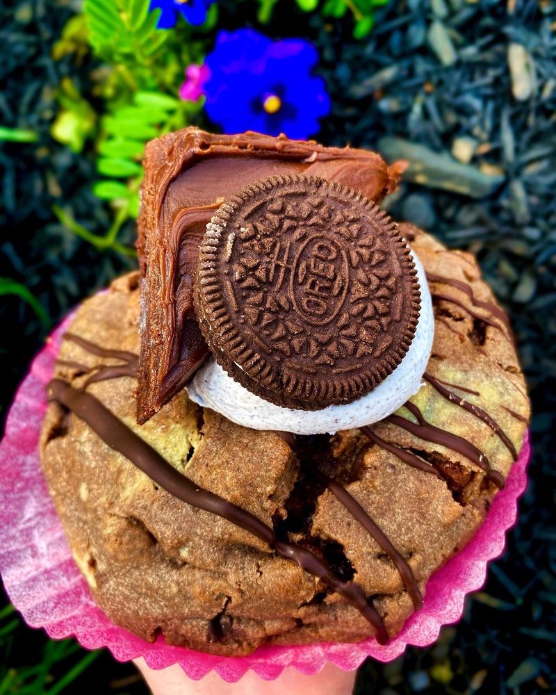 A chocolate cupcake topped with a swirl of mocha buttercream with oreos & chocolate chip cookies baked in, & topped with cookies.